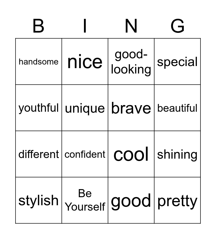 This bingo card has 16 words: Be Yourself, shining, good-looking, handsome, different, nice, cool, good, youthful, unique, stylish, special, confident, beautiful, brave and pretty.