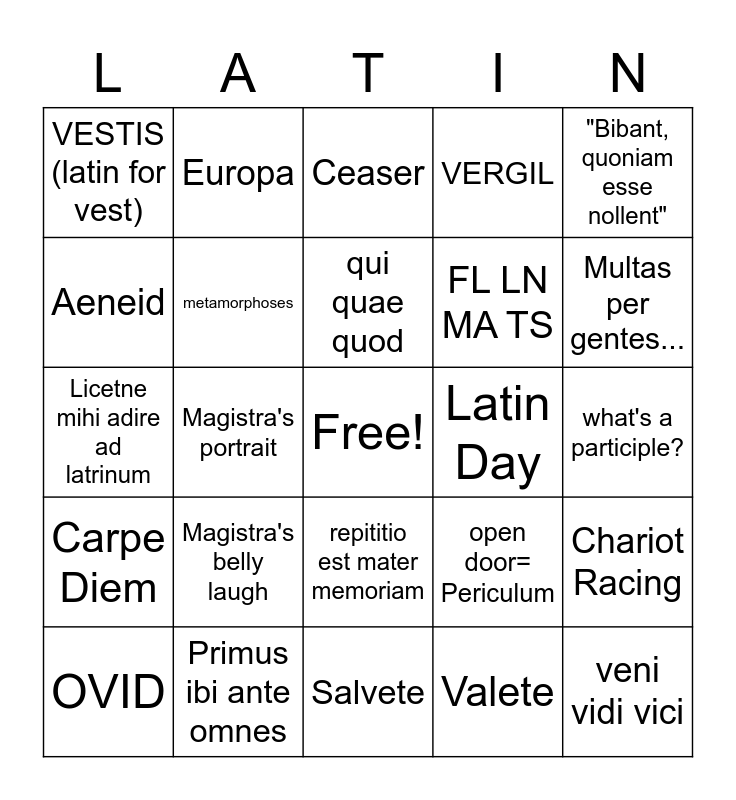 This bingo card has a free space and 27 words: open door= Periculum, Frazier, FL LN MA TS, Salvete, Aeneid, Ceaser, Europa, Carpe Diem, Latin Day, Chariot Racing, Licetne mihi adire ad latrinum, VERGIL, OVID, Primus ibi ante omnes, Multas per gentes..., Catullus (arguably the best poet ever), metamorphoses, qui quae quod, Magistra's belly laugh, VESTIS (latin for vest), what's a participle?, Valete, Magistra's portrait, veni vidi vici, repititio est mater memoriam, "Bibant, quoniam esse nollent" and "Jan Frazier, Latin" (answering phone).