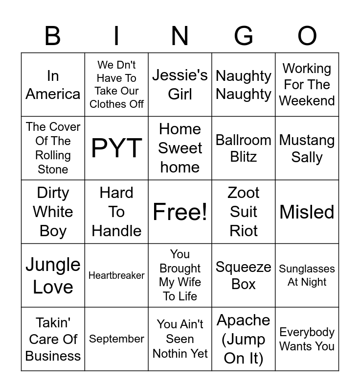 This bingo card has a free space and 40 words: Footlong Weinee, Dirty White Boy, Bad To The Bone, PYT, September, You Brought My Wife To Life, Home Sweet home, Girls, Working For The Weekend, Jungle Love, Hard To Handle, Naughty Naughty, Everybody Wants You, Misled, Zoot Suit Riot, Heartbreaker, Just Like Paradise, In America, Long Cool Woman In A Black Dress, Jessie's Girl, Sunglasses At Night, Apache (Jump On It), Ballroom Blitz, The Cover Of The Rolling Stone, Rock & Roll Hoochie Koo, Jack & Diane, Glory Days, Who's Making Love, Fantastic Voyage, Let's Groove, Rock Steady, Takin' Care Of Business, Happy Together, Squeeze Box, Mustang Sally, You Ain't Seen Nothin Yet, You're My Best Friend, Joy To The World, We Dn't Have To Take Our Clothes Off and California Girls.