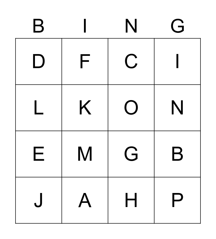 This bingo card has 16 words: A, B, C, D, E, F, G, H, L, K, J, I, M, N, O and P.