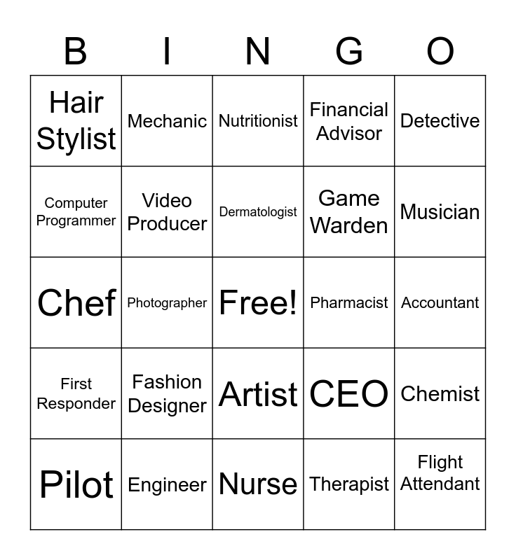 This bingo card has a free space and 44 words: Painter, Flight Attendant, Astronaut, Pilot, Building Contractor, Therapist, Nutritionist, Architect, Detective, Engineer, Financial Advisor, Pharmacist, Artist, Fashion Designer, Doctor, Nurse, Teacher, Chef, Marine Biologist, Musician, Mechanic, Fire Fighter, Coach, Hair Stylist, Lawyer, Accountant, Professional Athlete, Military, CEO, First Responder, Athletic Trainer, Chemist, Journalist, Author, Photographer, Chiropractor, Choreographer, Dental Hygienist, Dermatologist, Computer Programmer, Game Warden, Florist, Video Producer and Meteorologist.