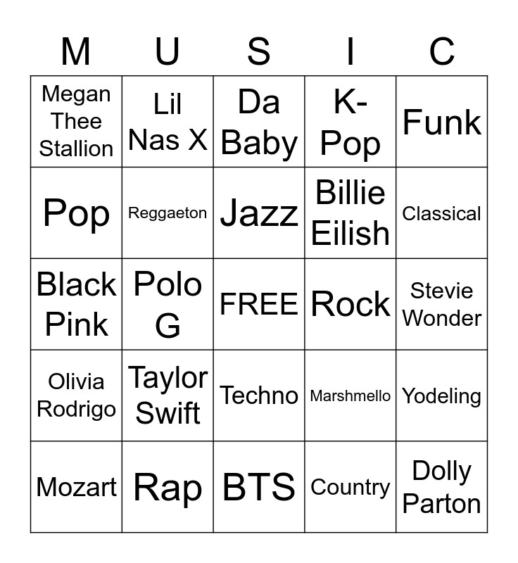 This bingo card has a free space and 24 words: Taylor Swift, Rap, Jazz, Mozart, Funk, Megan Thee Stallion, Pop, Lil Nas X, Rock, Techno, Billie Eilish, Black Pink, Marshmello, Yodeling, Reggaeton, Country, Stevie Wonder, Da Baby, Classical, Polo G, Dolly Parton, Olivia Rodrigo, K-Pop and BTS.
