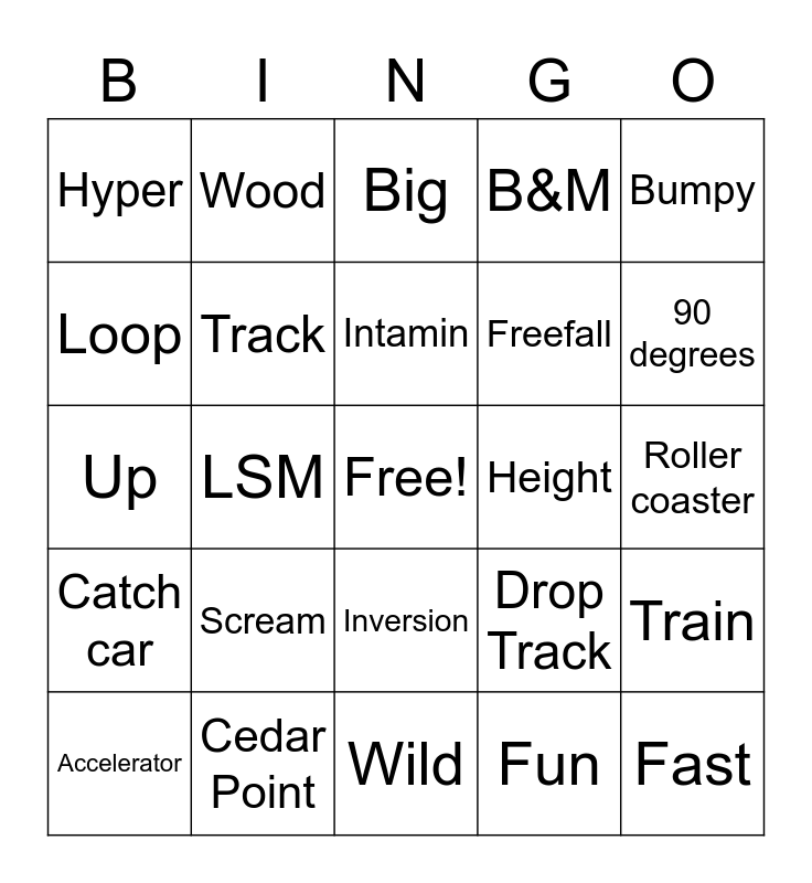 This bingo card has a free space and 39 words: Gravity, Speed, Steel, Drop Track, Train, Catch car, LSM, Theme Park, Height, Roller coaster, Loop, Wood, Bank Turn, 90 degrees, Up, Scream, Inversion, B&M, Giga, Accelerator, Track, Intamin, Fun, Bumpy, Six flags, Cedar Point, Wild, Insane, Awesome, Hyper, Mega, Strata, Freefall, Fast, Tall, Huge, Big, Brakes and Crazy.