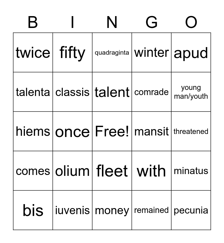 This bingo card has a free space and 24 words: olium, iuvenis, talent, bis, apud, twice, talenta, fifty, mansit, fleet, comrade, hiems, with, minatus, classis, remained, threatened, quadraginta, young man/youth, once, pecunia, comes, winter and money.