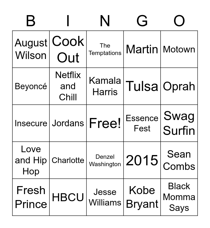 This bingo card has a free space and 39 words: A different World, BET, Barack Obama, 2015, Sean Combs, Love and Hip Hop, Jordans, Whitney Houston, Essence Fest, Swag Surfin, Beyoncé, Cook Out, Michael Jackson, Oprah, Insecure, Charlotte, Denzel Washington, Martin, Soul Food, Fresh Prince, Netflix and Chill, Kamala Harris, Kobe Bryant, Motown, PG, HBCU, Jesse Williams, James Baldwin, Jay-z, August Wilson, Spike Lee, Chadwick Boseman, Tulsa, Black Momma Says, Sam Cook, Stevie wonder, The Temptations, This is how we do it! and DMX.