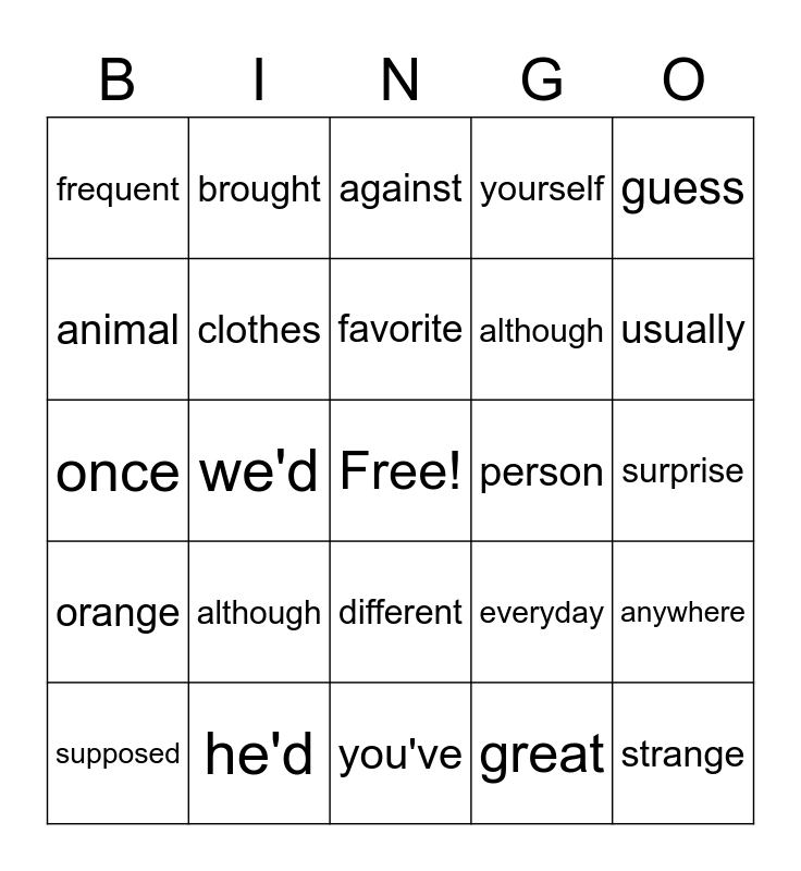 This bingo card has a free space and 24 words: although, he'd, favorite, supposed, guess, frequent, animal, brought, person, different, although, once, everyday, anywhere, clothes, great, surprise, against, usually, we'd, strange, orange, yourself and you've.
