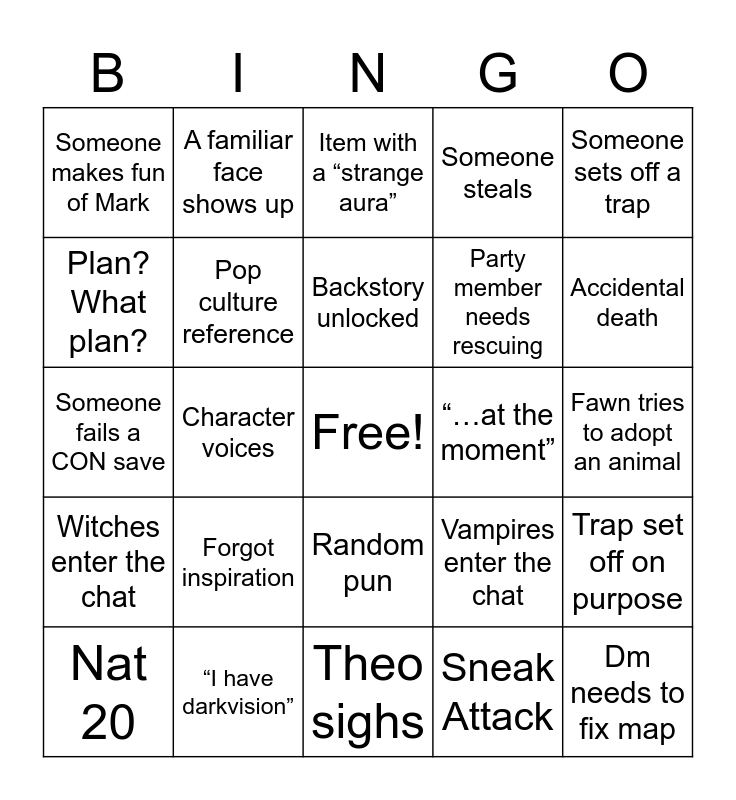 This bingo card has a free space and 44 words: Scott talks in riddles, Dm needs to fix map, Nat 1, Nat 20, “Roll for initiative”, Sneak Attack, Item with a “strange aura”, “Does a __ hit?”, Someone sets off a trap, “I have darkvision”, Someone steals, “…at the moment”, Random pun, Forgot inspiration, Same roll twice, Theo sighs, Party adopts NPC, Someone fails a CON save, “you can’t do that”, Accidental death, A familiar face shows up, Seduction, Drinking contest, Someone makes fun of Mark, Party forgets their goal, Fawn tries to adopt an animal, Scott remembers something at the wrong time, Cammy forgets to turn mic on, Vampires enter the chat, Witches enter the chat, Party spends too long on a puzzle, Trap set off on purpose, “you hear something in the distance”, Party backstab, Character voices, Blaming the roll, Someone forgets their abilities, Tavern/Inn, Backstory unlocked, Plan? What plan?, Party member needs rescuing, Music break, Pop culture reference and Harry steals.