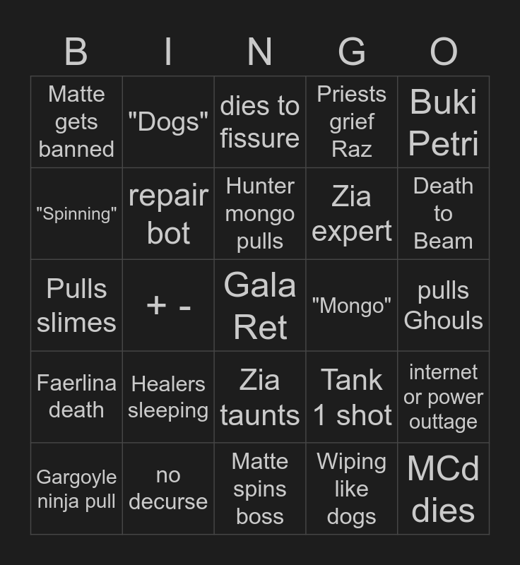 This bingo card has 25 words: Healers sleeping, Matte spins boss, Hunter mongo pulls, Gargoyle ninja pull, Buki Petri, Matte gets banned, "Spinning", "Dogs", "Mongo", Zia taunts, Zia expert, Pulls slimes, Tank 1 shot, internet or power outtage, repair bot, MCd dies, pulls Ghouls, dies to fissure, Death to Beam, + -, Gala Ret, no decurse, Faerlina death, Priests grief Raz and Wiping like dogs.