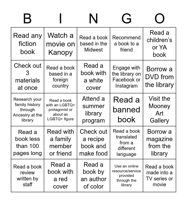 This bingo card has a free space and 31 words: Read a book by an author of color, Read a book by a woman, Read a book with an LGBTQ+ protagonist or about an LGBTQ+ figure, Read any non-fiction book, Read any fiction book, Read a book based in the Midwest, Read a book based in a foreign country, Read a book translated from a different language, Read a banned book, Use an online resource/service provided through the library, Visit the Mooney Art Gallery, Read a book made into a TV series or movie, Read a graphic novel or manga, Re-read a favorite book, Borrow a DVD from the library, Borrow a newspaper from the library, Borrow a magazine from the library, Read with a family member or friend, Read a book less than 100 pages long, Check out a recipe book and make food, Read a children’s or YA book, Ask a question to a librarian, Read a book review written by staff, Watch a movie on Kanopy, Engage with the library on Facebook or Instagram, Check out 3 materials at once, Recommend a book to a friend, Research your family history through Ancestry at the library, Read a book with a red cover, Read a book with a white cover and Read a book with an orange cover.