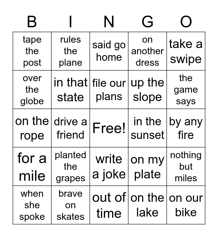 This bingo card has a free space and 24 words: planted the grapes, brave on skates, file our plans, when she spoke, take a swipe, tape the post, over the globe, rules the plane, in the sunset, write a joke, up the slope, on the rope, on my plate, nothing but miles, in that state, on the lake, by any fire, said go home, the game says, drive a friend, on our bike, for a mile, on another dress and out of time.