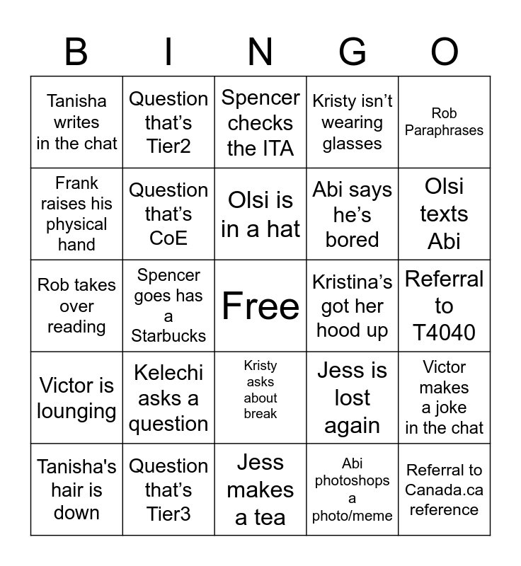 This bingo card has a free space and 24 words: Kelechi asks a question, Question that’s Tier3, Olsi is in a hat, Tanisha's hair is down, Rob Paraphrases, Tanisha writes in the chat, Frank raises his physical hand, Question that’s Tier2, Kristina’s got her hood up, Kristy asks about break, Abi says he’s bored, Rob takes over reading, Jess is lost again, Victor makes a joke in the chat, Question that’s CoE, Abi photoshops a photo/meme, Referral to T4040, Spencer checks the ITA, Olsi texts Abi, Spencer goes has a Starbucks, Referral to Canada.ca reference, Victor is lounging, Kristy isn’t wearing glasses and Jess makes a tea.