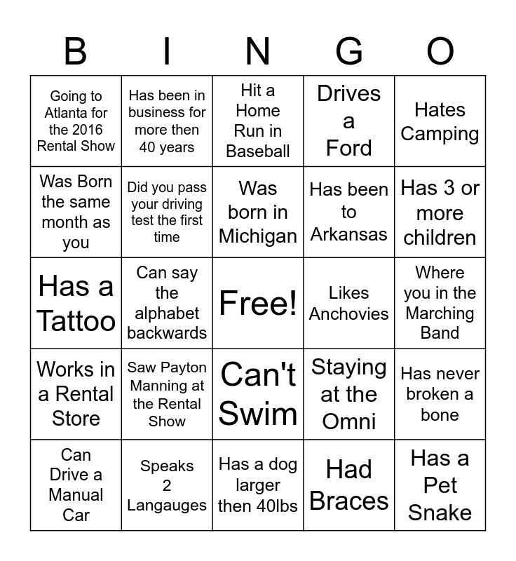 This bingo card has a free space and 24 words: Saw Payton Manning at the Rental Show, Speaks 2 Langauges, Was born in Michigan, Can Drive a Manual Car, Hates Camping, Going to Atlanta for the 2016 Rental Show, Was Born the same month as you, Has been in business for more then 40 years, Likes Anchovies, Can't Swim, Has been to Arkansas, Has a Tattoo, Staying at the Omni, Has never broken a bone, Did you pass your driving test the first time, Had Braces, Where you in the Marching Band, Hit a Home Run in Baseball, Has 3 or more children, Can say the alphabet backwards, Has a Pet Snake, Works in a Rental Store, Drives a Ford and Has a dog larger then 40lbs.