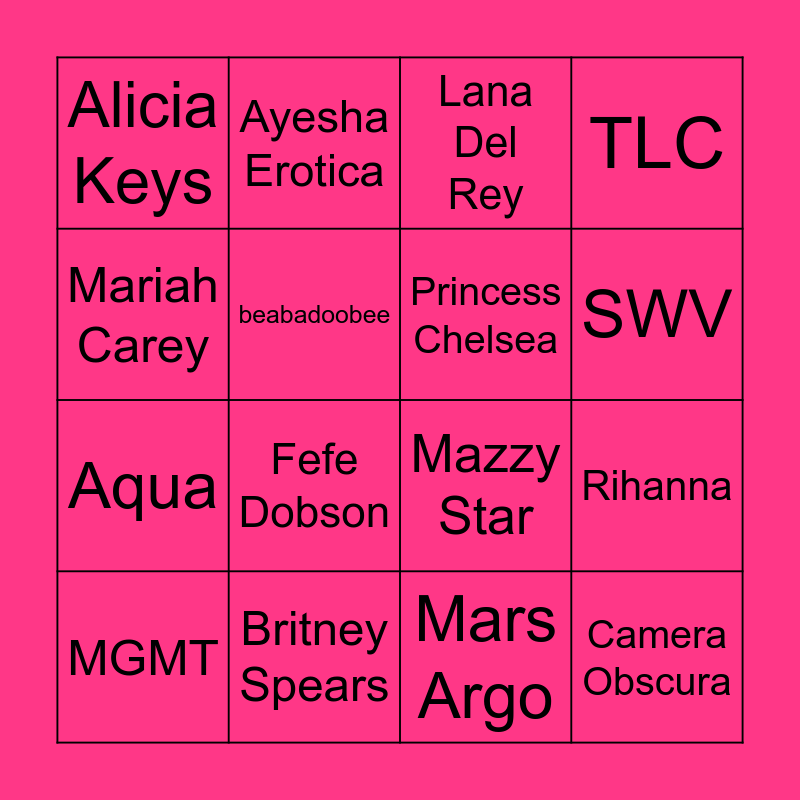 This bingo card has 16 words: MGMT, Britney Spears, Lana Del Rey, TLC, Mariah Carey, Ayesha Erotica, Mazzy Star, Rihanna, Alicia Keys, beabadoobee, Mars Argo, SWV, Aqua, Fefe Dobson, Princess Chelsea and Camera Obscura.