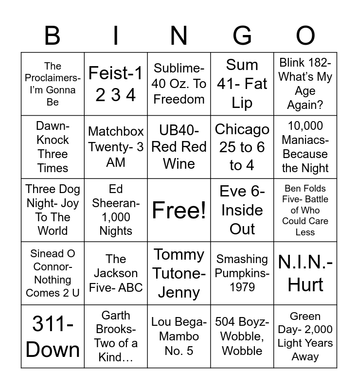 This bingo card has a free space and 25 words: The Jackson Five- ABC, Lou Bega- Mambo No. 5, UB40- Red Red Wine, 311-Down, Blink 182- What’s My Age Again?, The Proclaimers- I’m Gonna Be, Dawn- Knock Three Times, Feist-1 2 3 4, Eve 6- Inside Out, Tommy Tutone- Jenny, Chicago 25 to 6 to 4, Three Dog Night- Joy To The World, Smashing Pumpkins- 1979, N.I.N.- Hurt, Matchbox Twenty- 3 AM, A Perfect Circle- 3 Libras, Ben Folds Five- Battle of Who Could Care Less, Sublime- 40 Oz. To Freedom, 10,000 Maniacs- Because the Night, Ed Sheeran- 1,000 Nights, Green Day- 2,000 Light Years Away, Garth Brooks- Two of a Kind…, Sinead O Connor- Nothing Comes 2 U, Sum 41- Fat Lip and 504 Boyz- Wobble, Wobble.