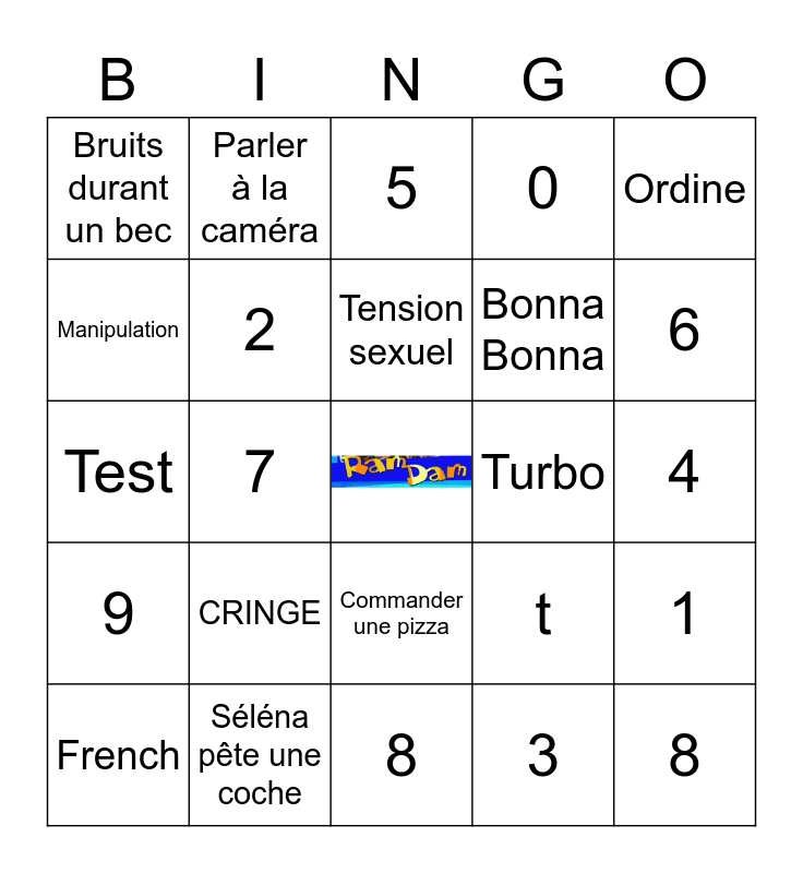 This bingo card has a free space and 24 words: CRINGE, Séléna pête une coche, Tension sexuel, French, Ordine, Bruits durant un bec, Manipulation, Parler à la caméra, Turbo, Commander une pizza, Bonna Bonna, Test, t, 1, 2, 3, 4, 5, 6, 7, 8, 9, 0 and 8.