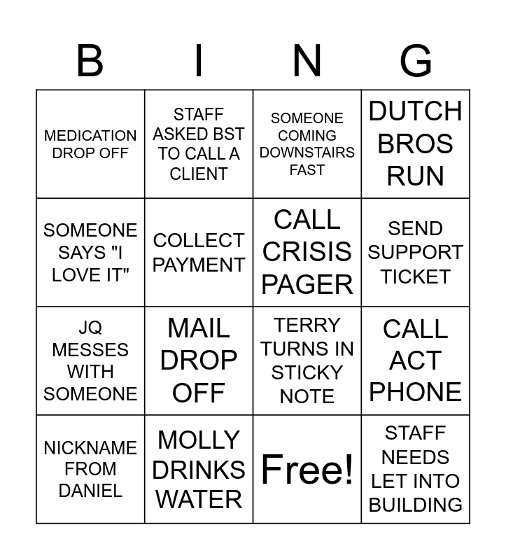 This bingo card has 17 words: Free!, NICKNAME FROM DANIEL, SOMEONE COMING DOWNSTAIRS FAST, MEDICATION DROP OFF, MAIL DROP OFF, DUTCH BROS RUN, CALL ACT PHONE, CALL CRISIS PAGER, SEND SUPPORT TICKET, COLLECT PAYMENT, MOLLY DRINKS WATER, TERRY TURNS IN STICKY NOTE, SOMEONE SAYS "I LOVE IT", STAFF ASKED BST TO CALL A CLIENT, JQ MESSES WITH SOMEONE, SOMEONE GRABS CREAMER and STAFF NEEDS LET INTO BUILDING.