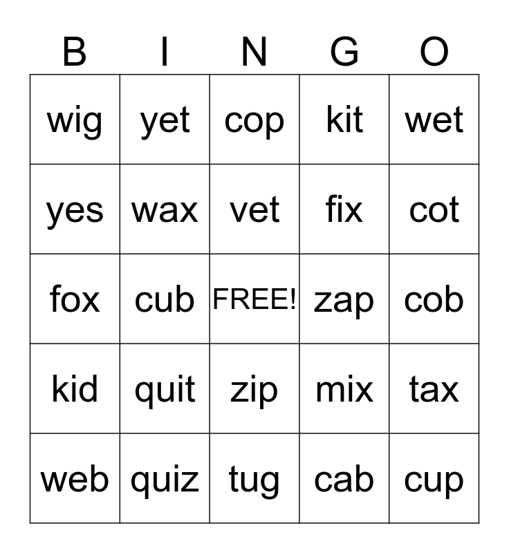 This bingo card has a free space and 24 words: quit, quiz, vet, web, wet, wig, yes, yet, zap, zip, fix, fox, mix, tax, wax, cab, cob, cop, cot, cub, cup, kid, kit and tug.