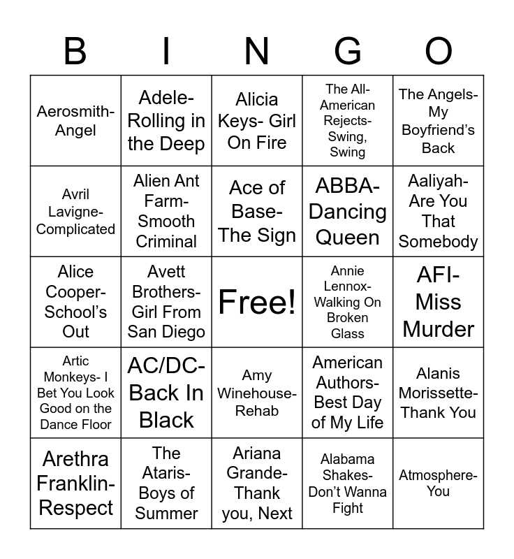 This bingo card has a free space and 25 words: AC/DC- Back In Black, Ariana Grande- Thank you, Next, Ace of Base- The Sign, Arethra Franklin- Respect, The Angels- My Boyfriend’s Back, Aerosmith- Angel, Avril Lavigne- Complicated, Adele- Rolling in the Deep, Annie Lennox- Walking On Broken Glass, Amy Winehouse- Rehab, ABBA- Dancing Queen, Alice Cooper- School’s Out, American Authors- Best Day of My Life, Alanis Morissette- Thank You, Alien Ant Farm- Smooth Criminal, Afroman- Because I Got High, AFI-Miss Murder, Alicia Keys- Girl On Fire, Aaliyah- Are You That Somebody, Avett Brothers- Girl From San Diego, Atmosphere- You, The Ataris- Boys of Summer, Artic Monkeys- I Bet You Look Good on the Dance Floor, The All-American Rejects- Swing, Swing and Alabama Shakes- Don’t Wanna Fight.