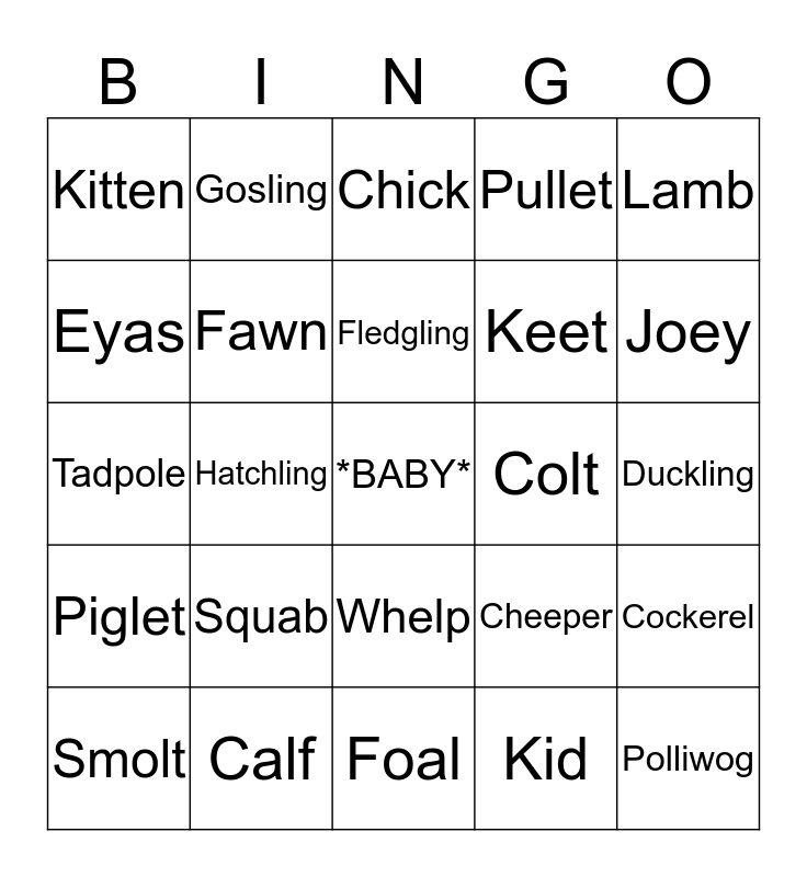This bingo card has a free space and 30 words: Calf, Pup, Hatchling, Larva, Kitten, Chick, Fawn, Whelp, Colt, Foal, Duckling, Polliwog, Kid, Gosling, Joey, Owlet, Cheeper, Piglet, Squab, Lamb, Tadpole, Bunny, Gosling, Keet, Eyas, Pullet, Cockerel, Smolt, Fledgling and Cygnet.