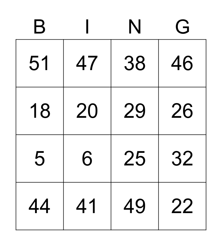 This bingo card has 55 words: 1, 16, 31, 46, 2, 17, 32, Free!, 47, 3, 18, 48, 4, 19, 33, 49, 5, 20, 34, 50, 6, 21, 35, 51, 7, 22, 36, 52, 8, 23, 37, 53, 9, 24, 38, 54, 10, 25, 39, 11, 26, 40, 12, 27, 41, 13, 28, 42, 14, 29, 43, 15, 30, 44 and 45.