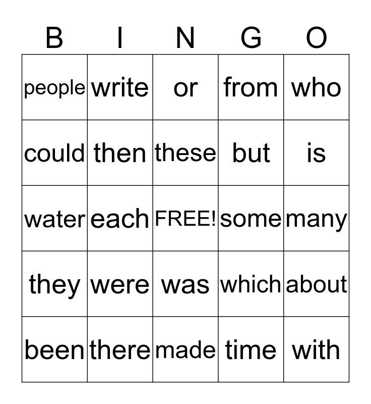 This bingo card has a free space and 24 words: were, there, these, been, who, people, could, write, some, was, but, water, which, about, then, time, many, or, is, each, with, they, from and made.