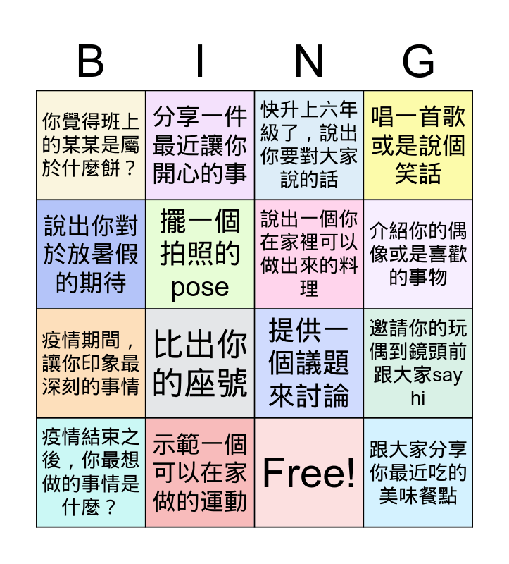 This bingo card has 16 words: 示範一個可以在家做的運動, 邀請你的玩偶到鏡頭前跟大家say hi, 快升上六年級了,說出你要對大家說的話, 你覺得班上的某某是屬於什麼餅?, 疫情期間,讓你印象最深刻的事情, 分享一件最近讓你開心的事, 提供一個議題來討論, Free!, 說出你對於放暑假的期待, 擺一個拍照的pose, 疫情結束之後,你最想做的事情是什麼?, 唱一首歌或是說個笑話, 比出你的座號, 介紹你的偶像或是喜歡的事物, 說出一個你在家裡可以做出來的料理 and 跟大家分享你最近吃的美味餐點.