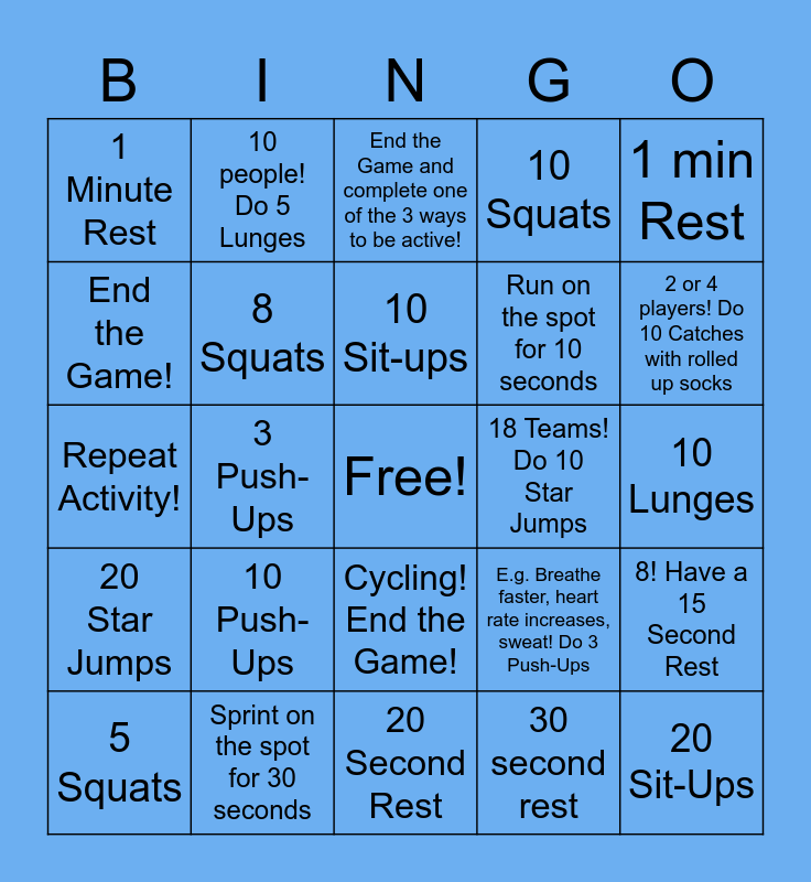 This bingo card has a free space and 24 words: 10 Push-Ups, Sprint on the spot for 30 seconds, 10 Sit-ups, 5 Squats, 1 min Rest, 1 Minute Rest, End the Game!, 10 people! Do 5 Lunges, 18 Teams! Do 10 Star Jumps, Cycling! End the Game!, Run on the spot for 10 seconds, Repeat Activity!, E.g. Breathe faster, heart rate increases, sweat! Do 3 Push-Ups, 8! Have a 15 Second Rest, 8 Squats, 30 second rest, 10 Lunges, End the Game and complete one of the 3 ways to be active!, 2 or 4 players! Do 10 Catches with rolled up socks, 3 Push-Ups, 20 Sit-Ups, 20 Star Jumps, 10 Squats and 20 Second Rest.