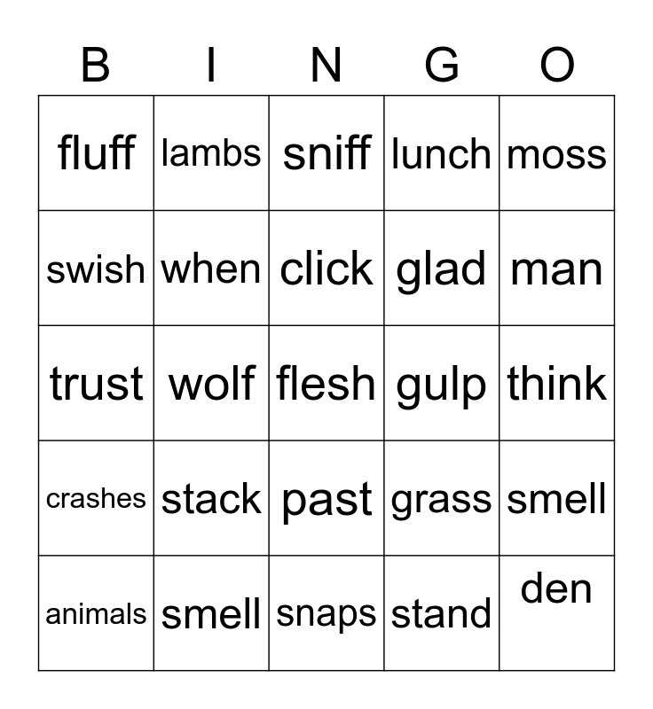 This bingo card has a free space and 44 words: snug, den, catches, animals, hunting, stand, sniff, strong, moss, smell, lunch, gulp, past, stack, twig, snaps, trodden, trust, men, man, lambs, protect, spotted, fluff, quick, think, fast, long, grass, crashes, plants, smell, slink, small, wolf, blink, blackness, trotting, click, swish, glad, didn't, when and kill.