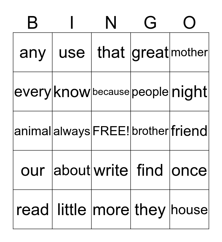 This bingo card has a free space and 24 words: about, little, because, read, mother, any, every, use, brother, write, people, animal, find, once, know, they, friend, that, night, always, house, our, great and more.