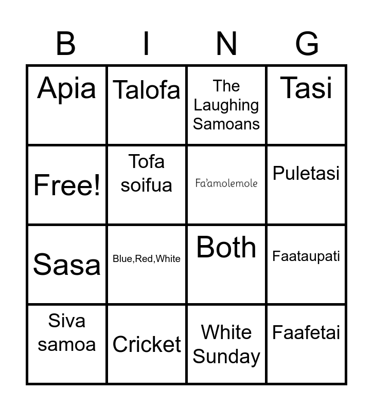 This bingo card has 2 images and 15 words: Cricket, Faataupati, The Laughing Samoans, Apia, Sasa, Talofa, Both, White Sunday, Free!, Tofa soifua, Siva samoa, Tasi, Blue,Red,White, Puletasi and Faafetai.