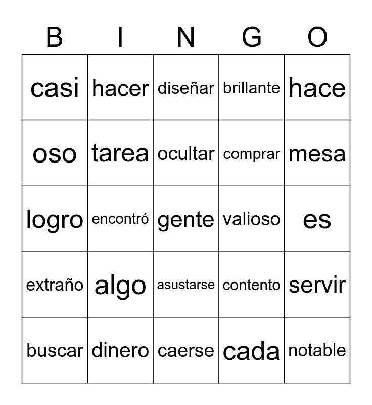 This bingo card has 48 words: mientras, gente, quiere, caerse, algo, algunas, hacer, luego, oso, tierra, tarea, brillante, servir, contento, gastado, alegre, ocultar, valioso, mujer, hace, encontró, cada, casi, comprar, hasta, mesa, buscar, contener, asustarse, extraño, inclinarse, echar, agradecido, pueblo, dinero, de, aire, es, nada, trabajo, invento, notable, diseñar, cantidad, logro, lograr, componer and resultado.