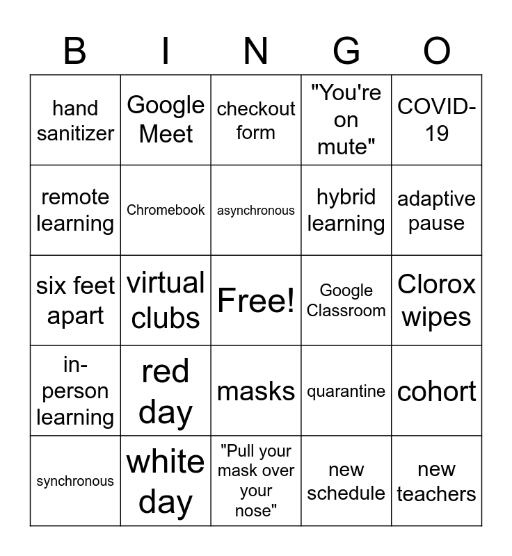 This bingo card has a free space and 24 words: red day, white day, asynchronous, synchronous, COVID-19, hand sanitizer, remote learning, Google Meet, Google Classroom, masks, hybrid learning, six feet apart, quarantine, cohort, Chromebook, new schedule, Clorox wipes, checkout form, adaptive pause, virtual clubs, new teachers, in-person learning, "You're on mute" and "Pull your mask over your nose".