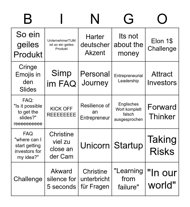 This bingo card has a free space and 24 words: Christine viel zu close an der Cam, Akward silence for 5 seconds, Personal Journey, Challenge, Elon 1$ Challenge, So ein geiles Produkt, Cringe Emojis in den Slides, UnternehmerTUM ist so ein geiles Produkt, Englisches Wort komplett falsch ausgesprochen, Unicorn, Entrepreneurial Leadership, FAQ: "Is it possible to get the slides?" reeeeeeeeee, Startup, Taking Risks, Simp im FAQ, "Learning from failure", Forward Thinker, Harter deutscher Akzent, Attract Investors, KICK OFF REEEEEEEE, "In our world", FAQ "where can I start getting investors for my idea?", Its not about the money and Christine unterbricht für Fragen.