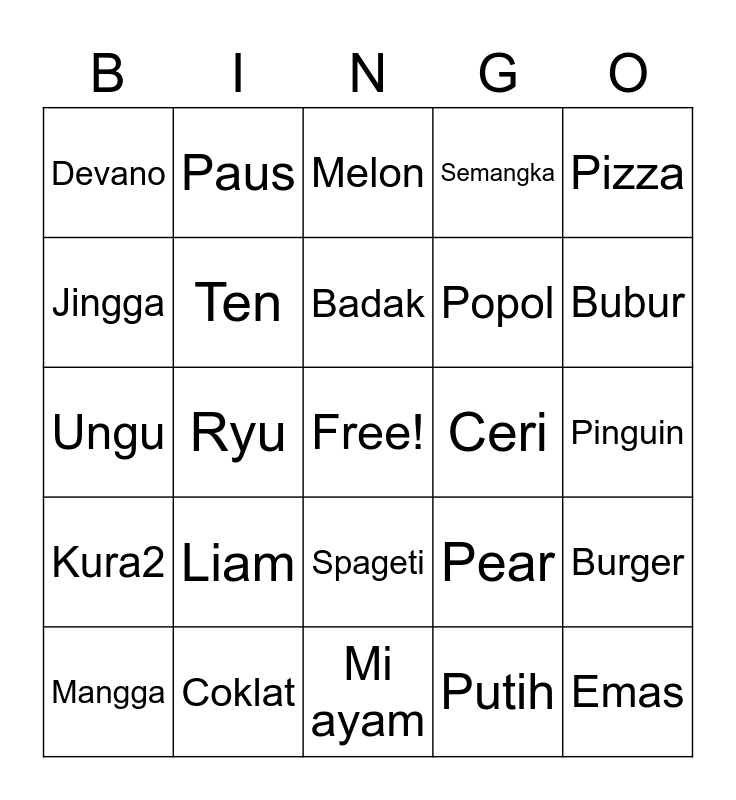 This bingo card has a free space and 24 words: Liam, Coklat, Badak, Mangga, Pizza, Devano, Jingga, Paus, Ceri, Spageti, Popol, Ungu, Pear, Burger, Ten, Putih, Pinguin, Melon, Bubur, Ryu, Emas, Kura2, Semangka and Mi ayam.