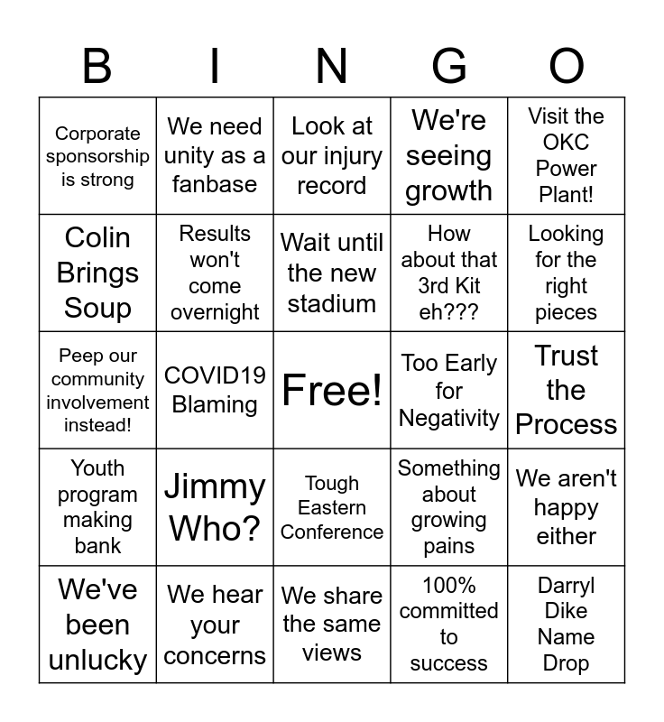 This bingo card has a free space and 24 words: Jimmy Who?, We hear your concerns, Wait until the new stadium, We've been unlucky, Visit the OKC Power Plant!, Corporate sponsorship is strong, Colin Brings Soup, We need unity as a fanbase, Too Early for Negativity, Tough Eastern Conference, How about that 3rd Kit eh???, Peep our community involvement instead!, Something about growing pains, We aren't happy either, Results won't come overnight, 100% committed to success, Trust the Process, Look at our injury record, Looking for the right pieces, COVID19 Blaming, Darryl Dike Name Drop, Youth program making bank, We're seeing growth and We share the same views.