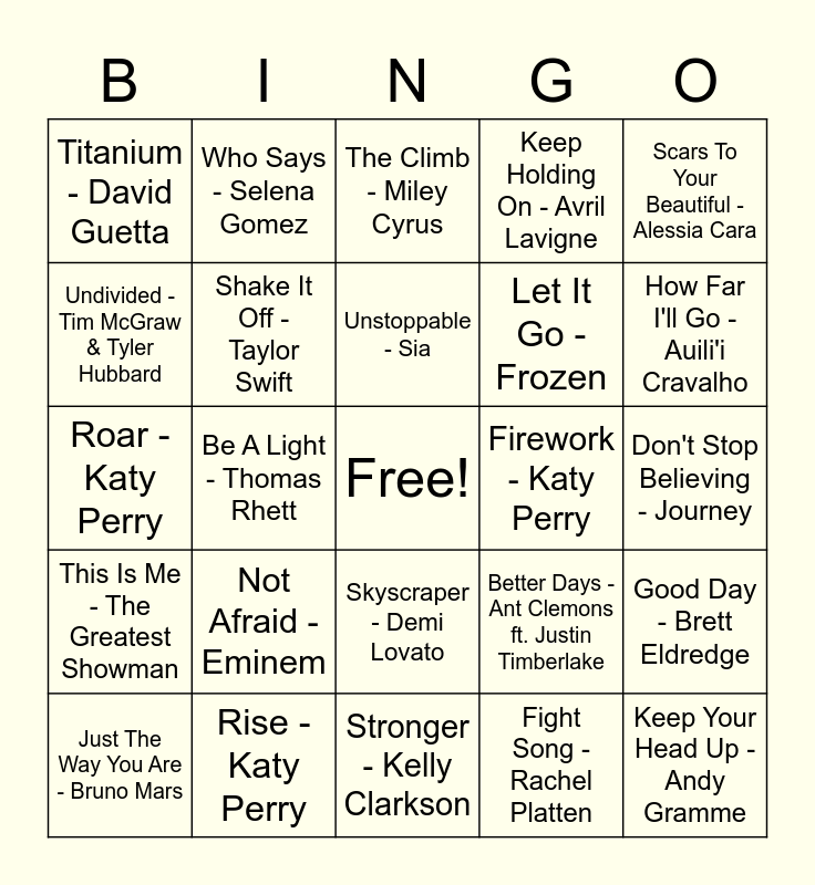 This bingo card has a free space and 34 words: Underdog - Alicia Keys, Fight Song - Rachel Platten, Rise Up - Andra Day, Born This Way - Lady Gaga, This Is Me - The Greatest Showman, Shake It Off - Taylor Swift, Scars To Your Beautiful - Alessia Cara, Just The Way You Are - Bruno Mars, Who Says - Selena Gomez, Beautiful - Christina Aguilera, Unstoppable - Sia, The Climb - Miley Cyrus, Try - Colbie Caillat, Brave - Sara Bareilles, Firework - Katy Perry, How Far I'll Go - Auili'i Cravalho, Rise - Katy Perry, Roar - Katy Perry, Not Afraid - Eminem, Better Days - Ant Clemons ft. Justin Timberlake, Skyscraper - Demi Lovato, Survivor - Destiny's Child, Titanium - David Guetta, Don't Stop Believing - Journey, Stronger - Kelly Clarkson, Keep Your Head Up - Andy Gramme, Keep Holding On - Avril Lavigne, I'm Still Standing - Elton John, Let It Go - Frozen, Undivided - Tim McGraw & Tyler Hubbard, Worldwide Beautiful - Kane Brown, Be A Light - Thomas Rhett, Good Day - Brett Eldredge and Eye Of The Tiger - Survivor.