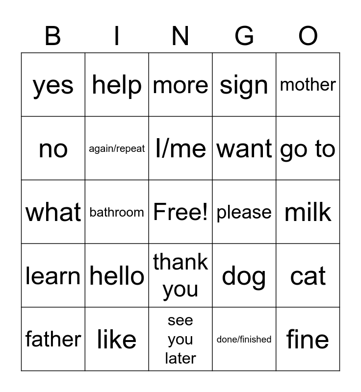 This bingo card has a free space and 25 words: hello, see you later, I/me, father, mother, yes, no, help, please, thank you, want, what, dog, cat, again/repeat, eat/food, milk, more, go to, bathroom, fine, like, learn, sign and done/finished.