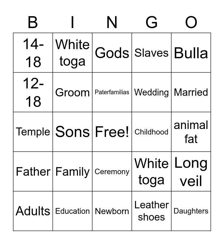 This bingo card has a free space and 24 words: Family, Education, Paterfamilias, Adults, Bulla, 14-18, 12-18, White toga, Childhood, Ceremony, Wedding, Temple, White toga, Long veil, Groom, Leather shoes, animal fat, Gods, Married, Sons, Daughters, Father, Slaves and Newborn.