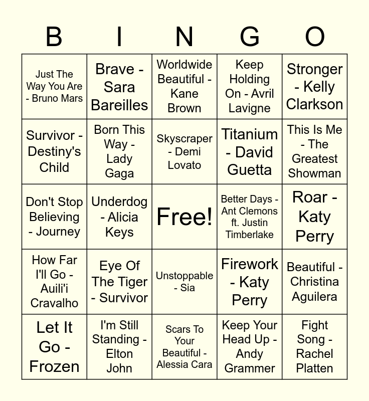 This bingo card has a free space and 34 words: Be A Light - Thomas Rhett, Keep Your Head Up - Andy Grammer, Try - Colbie Caillat, Shake It Off - Taylor Swift, How Far I'll Go - Auili'i Cravalho, Born This Way - Lady Gaga, Stronger - Kelly Clarkson, Let It Go - Frozen, Brave - Sara Bareilles, Good Day - Brett Eldredge, Skyscraper - Demi Lovato, Worldwide Beautiful - Kane Brown, Rise Up - Andra Day, Who Says - Selena Gomez, Better Days - Ant Clemons ft. Justin Timberlake, This Is Me - The Greatest Showman, I'm Still Standing - Elton John, Don't Stop Believing - Journey, Eye Of The Tiger - Survivor, Firework - Katy Perry, Unstoppable - Sia, Undivided - Tim McGraw & Tyler Hubbard, Just The Way You Are - Bruno Mars, Roar - Katy Perry, Scars To Your Beautiful - Alessia Cara, Fight Song - Rachel Platten, Keep Holding On - Avril Lavigne, Rise - Katy Perry, Titanium - David Guetta, Survivor - Destiny's Child, The Climb - Miley Cyrus, Underdog - Alicia Keys, Beautiful - Christina Aguilera and Not Afraid - Eminem.