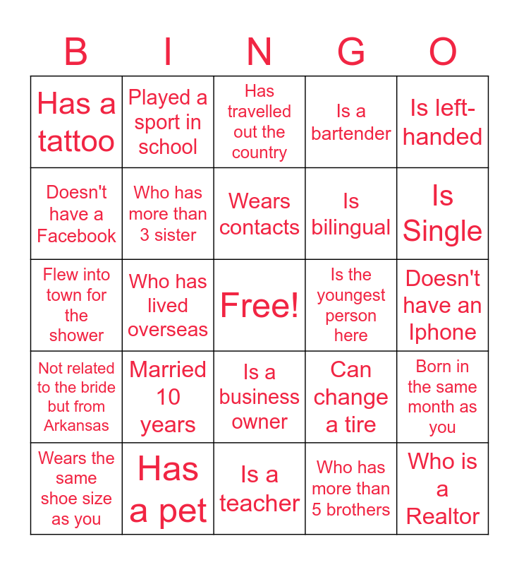 This bingo card has a free space and 24 words: Married 10 years, Has a pet, Wears contacts, Wears the same shoe size as you, Is left-handed, Has a tattoo, Doesn't have a Facebook, Played a sport in school, Is the youngest person here, Is a business owner, Is bilingual, Flew into town for the shower, Can change a tire, Born in the same month as you, Who has more than 3 sister, Who has more than 5 brothers, Doesn't have an Iphone, Has travelled out the country, Is Single, Who has lived overseas, Who is a Realtor, Not related to the bride but from Arkansas, Is a bartender and Is a teacher.