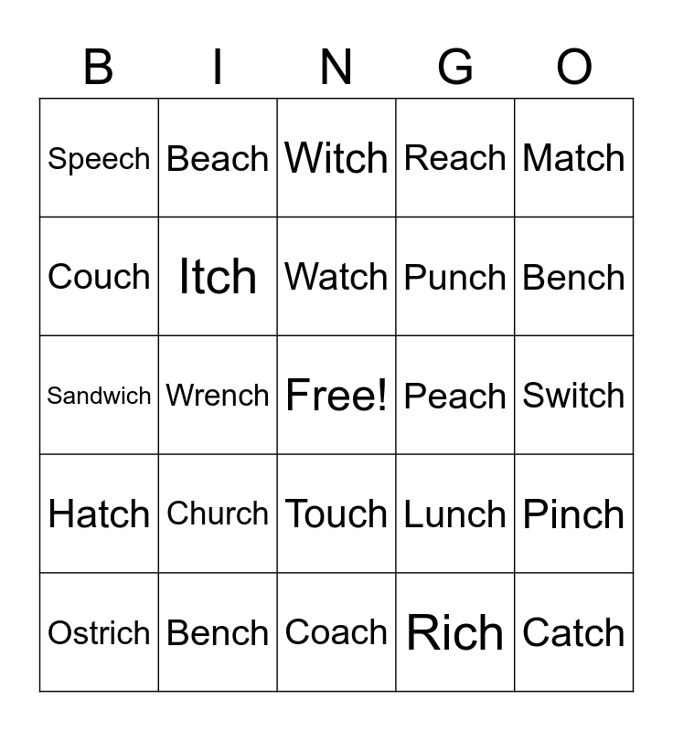 This bingo card has a free space and 24 words: Church, Bench, Watch, Ostrich, Match, Speech, Couch, Beach, Peach, Touch, Punch, Sandwich, Lunch, Pinch, Itch, Rich, Switch, Witch, Bench, Wrench, Catch, Hatch, Reach and Coach.