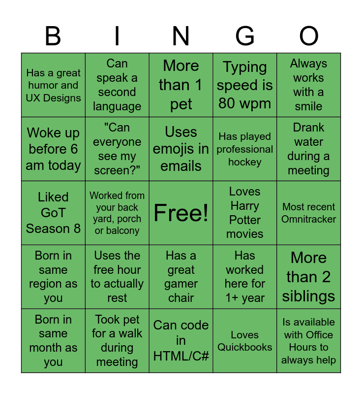 This bingo card has a free space and 27 words: Has worked here for 1+ year, Is a streamer, Has played professional hockey, Can code in HTML/C#, Woke up before 6 am today, More than 1 pet, Can speak a second language, Born in same region as you, Loves Harry Potter movies, More than 2 siblings, Liked GoT Season 8, Typing speed is 80 wpm, Born in same month as you, Took pet for a walk during meeting, Drank water during a meeting, "Sorry I was on mute", "Can everyone see my screen?", Uses emojis in emails, Uses the free hour to actually rest, Has a great humor and UX Designs, Most recent Omnitracker, Loves Quickbooks, Worked from your back yard, porch or balcony, Is available with Office Hours to always help, Has a great gamer chair, Always works with a smile and Works wearing pijamas.