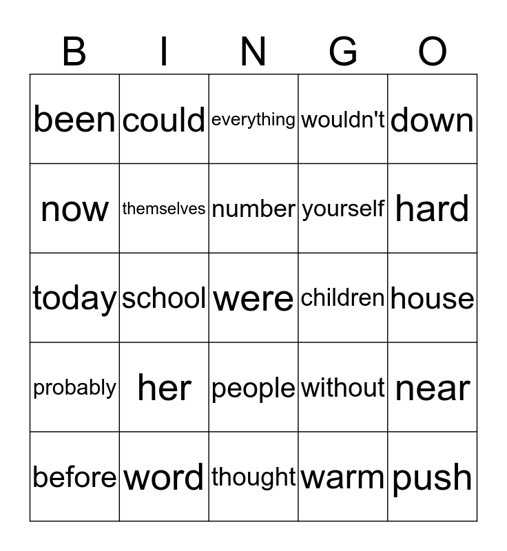 This bingo card has a free space and 24 words: her, word, number, before, down, been, now, could, children, people, yourself, today, without, near, themselves, warm, house, everything, hard, school, push, probably, wouldn't and thought.
