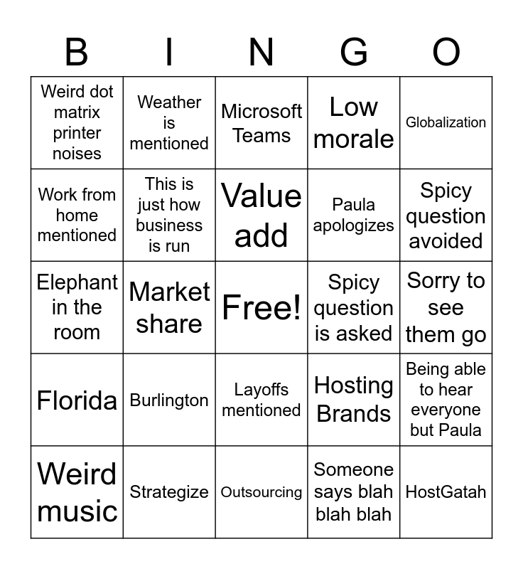 This bingo card has a free space and 29 words: Weird music, A dog barks, Market share, Wrong slide, Weird dot matrix printer noises, Microsoft Teams, This is just how business is run, Burlington, Spicy question is asked, Strategize, Sorry to see them go, HostGatah, Outsourcing, Someone says blah blah blah, Spicy question avoided, Transparency, Layoffs mentioned, Florida, Globalization, Elephant in the room, Hosting Brands, Texas, Paula apologizes, Work from home mentioned, Low morale, Weather is mentioned, Being able to hear everyone but Paula, Value add and Personalization.