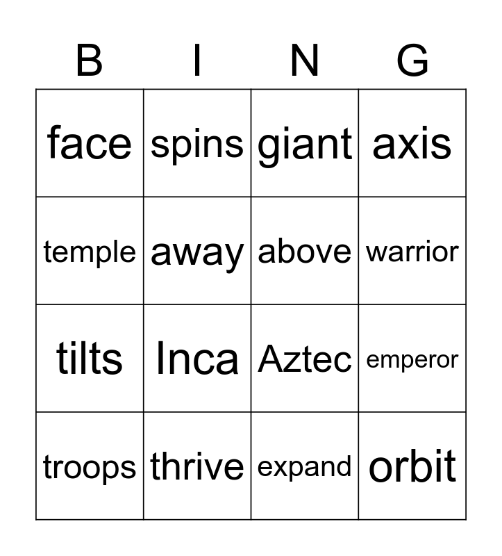 This bingo card has 16 words: thrive, emperor, giant, face, tilts, spins, Aztec, expand, temple, away, troops, axis, Inca, warrior, above and orbit.