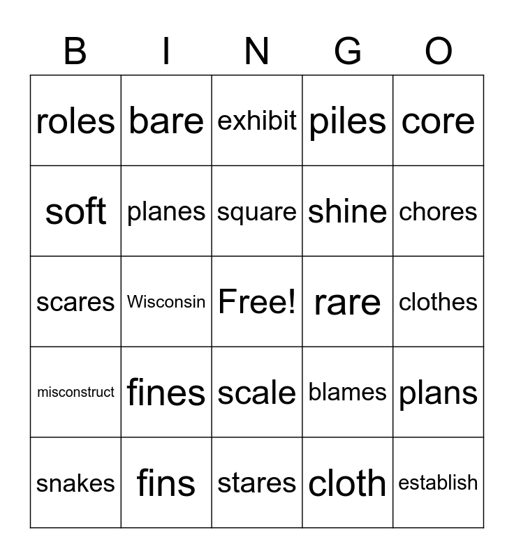 This bingo card has a free space and 24 words: fines, fins, square, snakes, core, roles, soft, bare, rare, scale, shine, scares, blames, plans, planes, cloth, clothes, exhibit, chores, Wisconsin, establish, misconstruct, piles and stares.