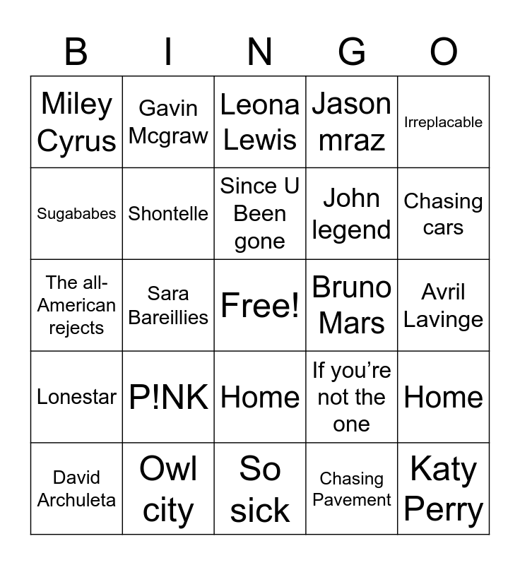 This bingo card has a free space and 29 words: David Archuleta, I knew you were trouble, Sara Bareillies, Yellow Coldplay, Miley Cyrus, Leona Lewis, Shontelle, P!NK, Bruno Mars, Owl city, Avril Lavinge, Katy Perry, So sick, Chasing Pavement, Chasing cars, Plain white Tees, Home, Lonestar, Irreplacable, The all-American rejects, If you’re not the one, Daniel powter, John legend, Sugababes, Jason mraz, Gavin Mcgraw, Home, Since U Been gone and Cosmic love.
