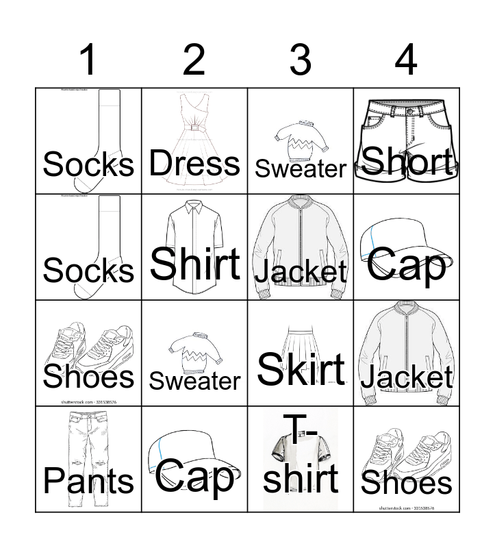 This bingo card has 16 images and 16 words: Cap, Jacket, Sweater, Socks, Shoes, Dress, Skirt, T-shirt, Socks, Shirt, Pants, Short, Sweater, Cap, Jacket and Shoes.
