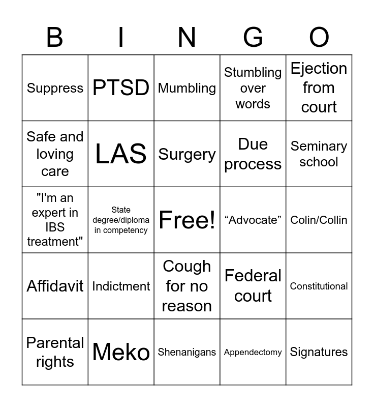 This bingo card has a free space and 90 words: Documentary Proof, Trolls, Cough for no reason, Perjury, New Song, ADA, Family Court, Trafficking, First Amendment, Abuse, Social Media, Public record, Satan or Demon, Colin/Collin, Colon, Surgery, Abuse assessment, Christian, Bible Reference, Medical Kidnapping, Loving Mother, Second Opinion, Shenanigans, Monkey Business, "I'm an expert in IBS treatment", Meko, Robert Baty, "I have the file", Jail Nutrition, Jurisdiction, Exculpatory, Constitutional, Documentary evidence, Affidavit, Suppress, Stumbling over words, Mumbling, Competency, State degree/diploma in competency, Seminary school, Parental rights, Safe and loving care, Dismiss with extreme prejudice, Multiple prosecutors, Gorgeous George, Federal court, Naturopathic, Medical malpractice, Cover up, Retaliation/retaliatory, Brady violation, Due process, Not a conspiracy theory, Pic line, PCH/Phoenix Children’s Hospital, CPS/DCFS, “Advocate”, Secret hearing/proceeding, Public excluded, “Waiting on one document”, Full colon, “Living breathing”, Fraud, Swindle, Gold standard, “Adult”, “Child”, Appendectomy, With intent, Denied access, Indictment, Signatures, Warrant, Journalist, PTSD, LAS, Glendale, Phoenix, Victim, Spectrum, Mr Tosto assaulted me, Ejection from court, Def. told to stop being a brat, Holding up random papers, Shrieking in court, ADA “advocate” kicked out, Admonished while testifying, Random muffled noises from side room, Taken into custody and Contempt.