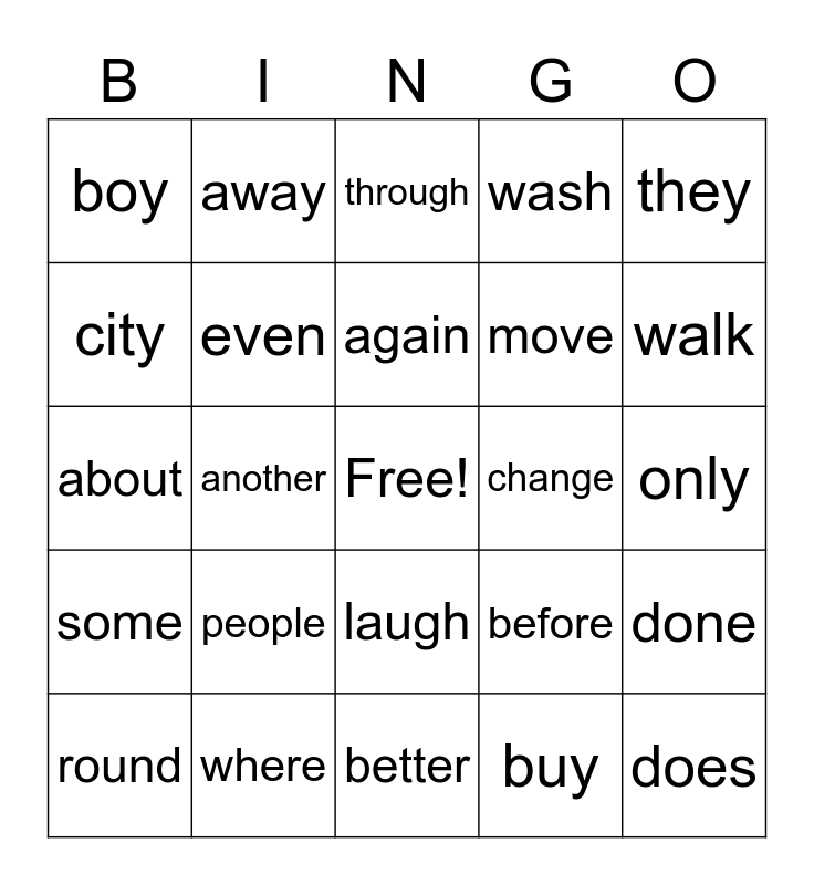 This bingo card has a free space and 24 words: people, where, again, round, they, boy, city, away, change, laugh, move, about, before, done, even, buy, only, through, walk, another, does, some, wash and better.